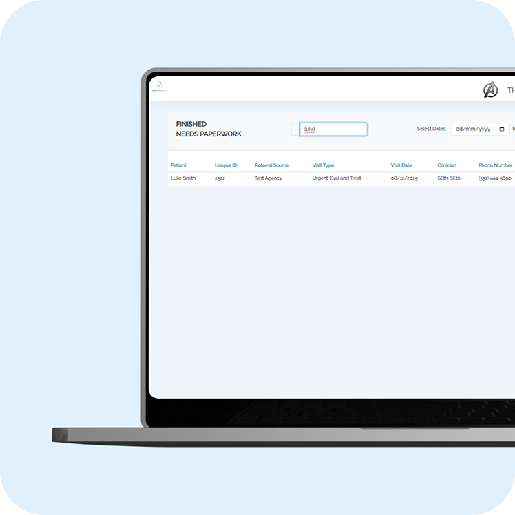 Accessible from the web app, it provides a centralized table view where administrators can edit patient information and see all relevant visit records along with details such as patient name, clinician, visit type, scheduling date, delivery date, and current paperwork status. The table includes filtering and sorting options that let administrators quickly locate a patient record.