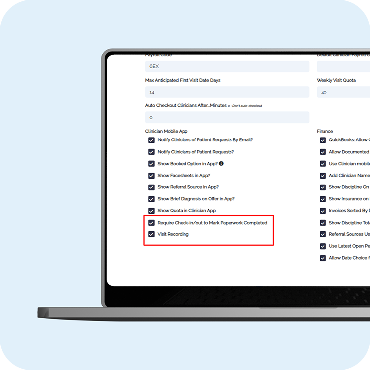 The Tenant Settings feature allows company administrators to configure operational rules and preferences that apply across both the web and mobile versions of CliniConnects. Accessible through the web app’s Company Settings, it provides control over key parameters such as whether mobile check-in/out is required to mark a visit as complete.